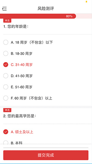 10、進(jìn)入【風(fēng)險測評】頁面,進(jìn)行相應(yīng)的填寫之后,如無問題則點(diǎn)擊【提交完成】。